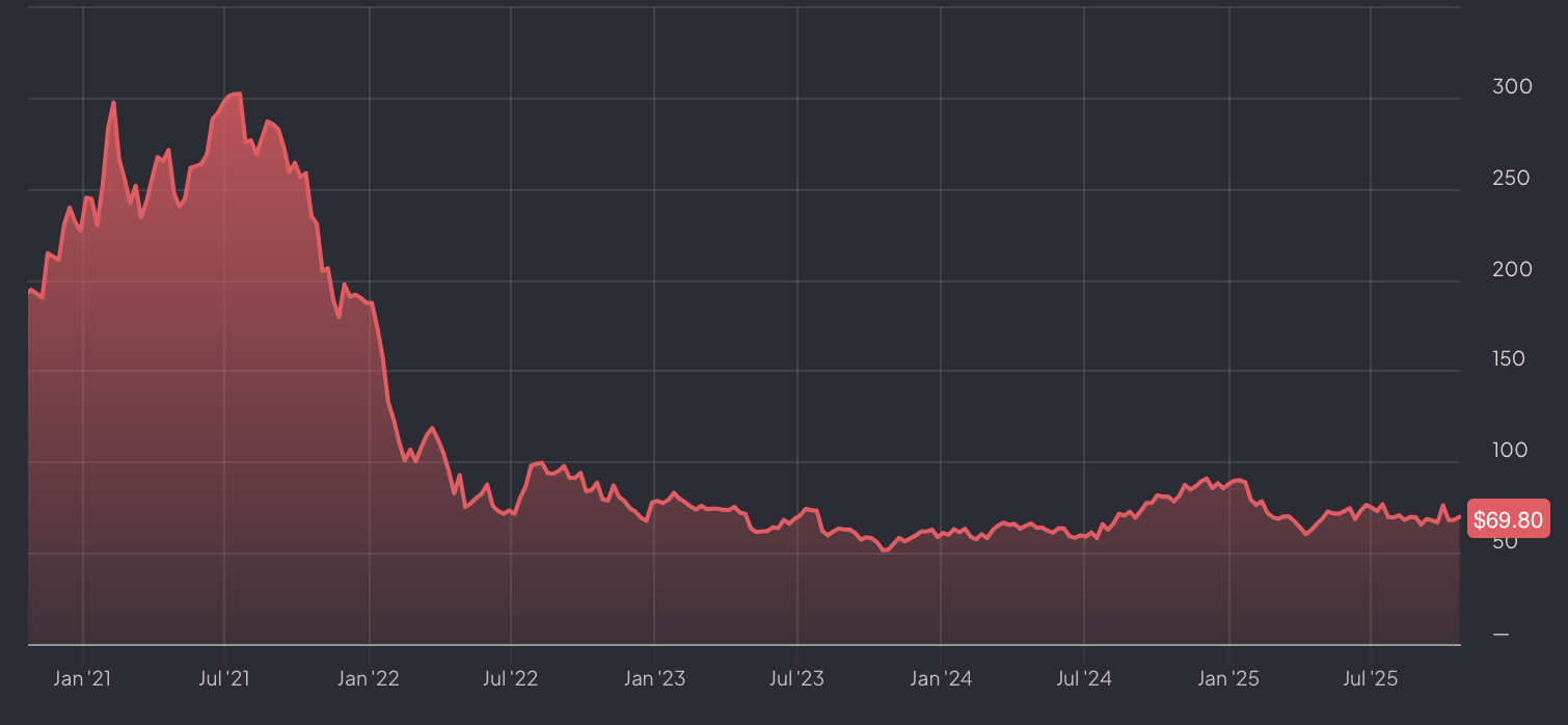 Колись PayPal торгувався по $300. Зараз — $69. Ринок списав цю компанію, прогнозуючи, що конкуренти поступово з'їдять її частку ринку. Але що, якщо ринок помиляється?